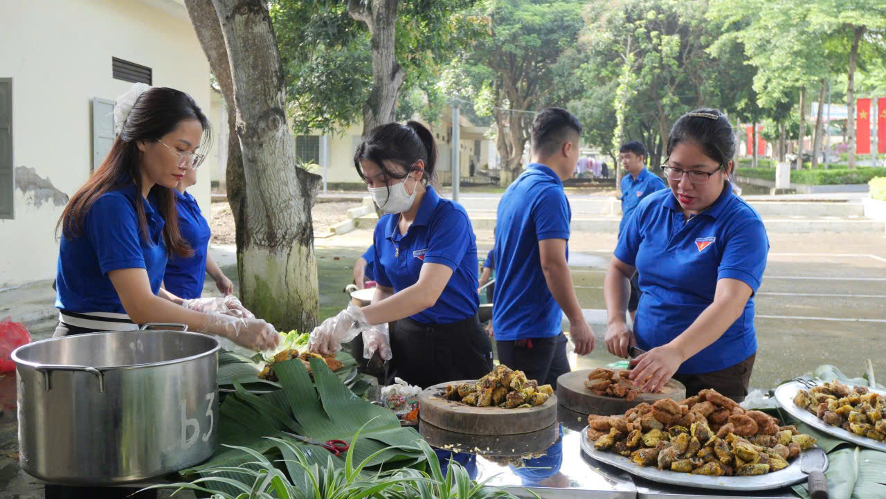 Ngay từ sáng sớm, đoàn viên thanh niên đã tất bật chuẩn bị nguyên liệu: bún lá tươi, đậu rán giòn, nem rán, chả cốm, thịt luộc, rau sống và mắm tôm được pha chế cẩn thận. Tất cả được trình bày đẹp mắt trong từng mẹt tre nhỏ, vừa dân dã vừa đậm đà hương vị truyền thống.