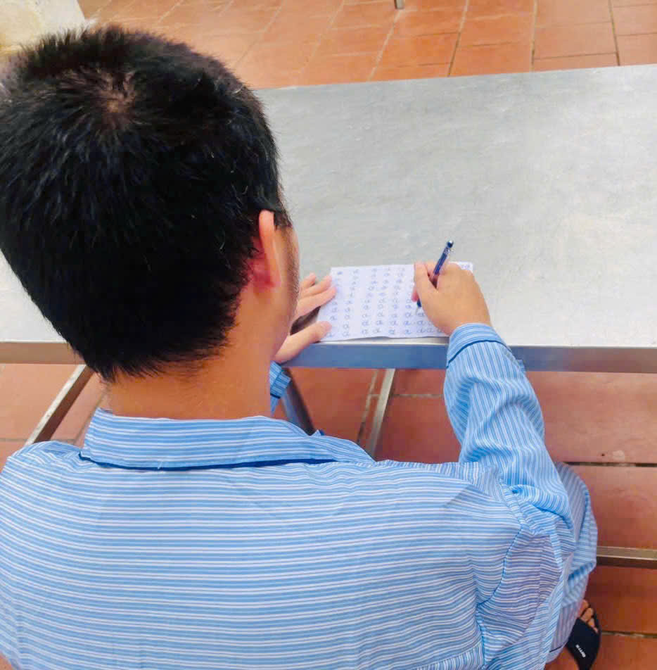 Và rồi, có một người chưa từng vắng mặt trong hành trình ấy — mẹ em. Mỗi tuần, bà lại lặn lội đến Trung tâm. Không ồn ào, không than thở. Bà chỉ lặng lẽ ngồi bên con. Bàn tay gầy guộc của bà nắm lấy bàn tay con, đặt vào đó một cây bút. “Con cầm như thế này… rồi viết theo mẹ…” Nét đầu tiên run rẩy… Nét thứ hai đứt quãng. Có lúc cây bút rơi khỏi tay, có lúc em quay đi, không hợp tác. Nhưng người mẹ ấy chưa từng bỏ cuộc. Tuần này qua tuần khác. Trang vở này sang trang vở khác. Chỉ một chữ duy nhất: “a”. Một chữ cái đơn giản nhất — nhưng với ĐA, đó là cả một hành trình dài. Rồi một ngày, Trung tâm tổ chức hoạt động: viết thư gửi về gia đình. Mọi người được phát giấy, phát bút. Không khí vừa háo hức, vừa lặng lẽ. Có người viết được vài dòng, có người chỉ vẽ nguệch ngoạc. ĐA ngồi đó. Nhìn. Rồi bất ngờ, em giơ tay. Một hành động nhỏ thôi — nhưng khiến những người xung quanh khựng lại. Em nhận giấy. Cầm bút. Những phút đầu tiên, em ngồi rất lâu. Như đang nhớ lại điều gì đó. Có thể là hình ảnh người mẹ, có thể là những buổi học chữ kiên trì.