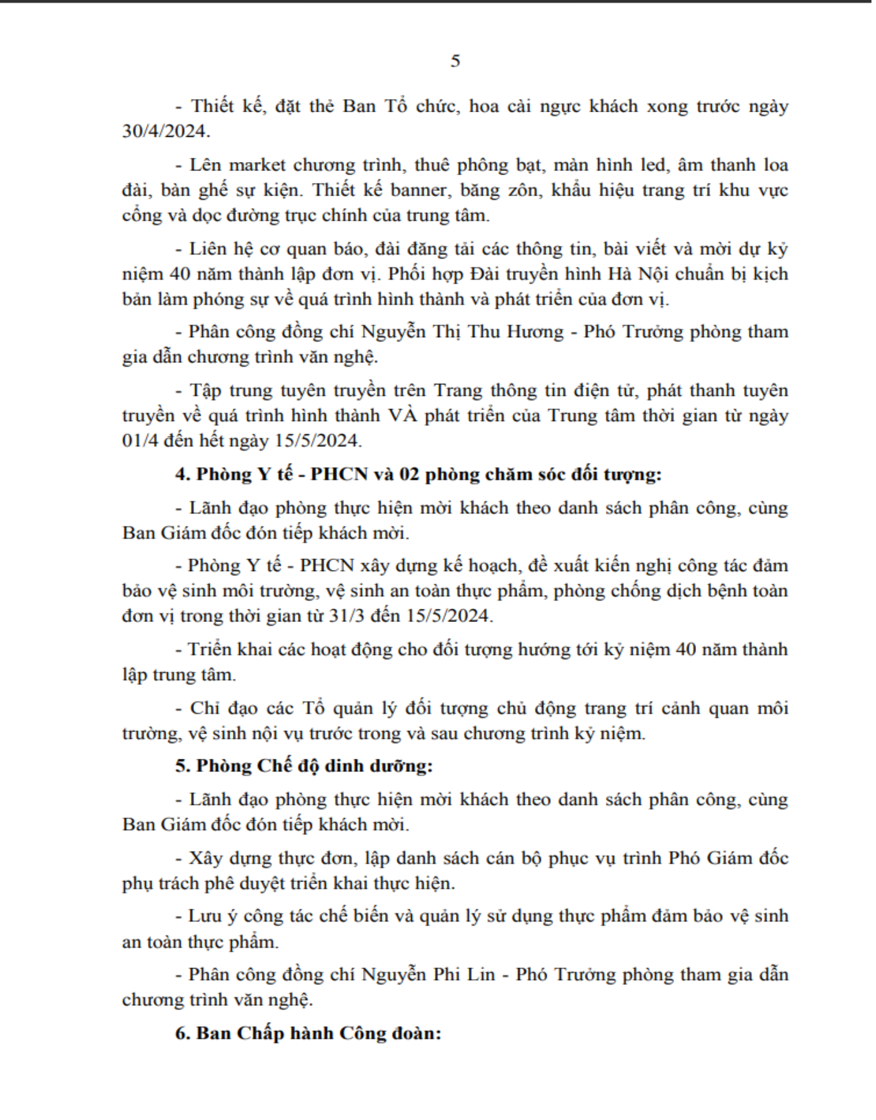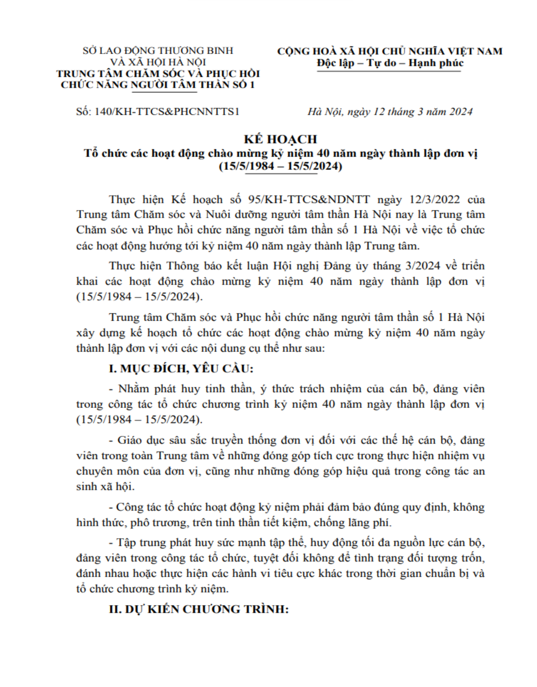 Kế hoạch Tổ chức các hoạt động chào mừng kỷ niệm 40 năm ngày thành lập đơn vị (15/5/1984 – 15/5/2024)