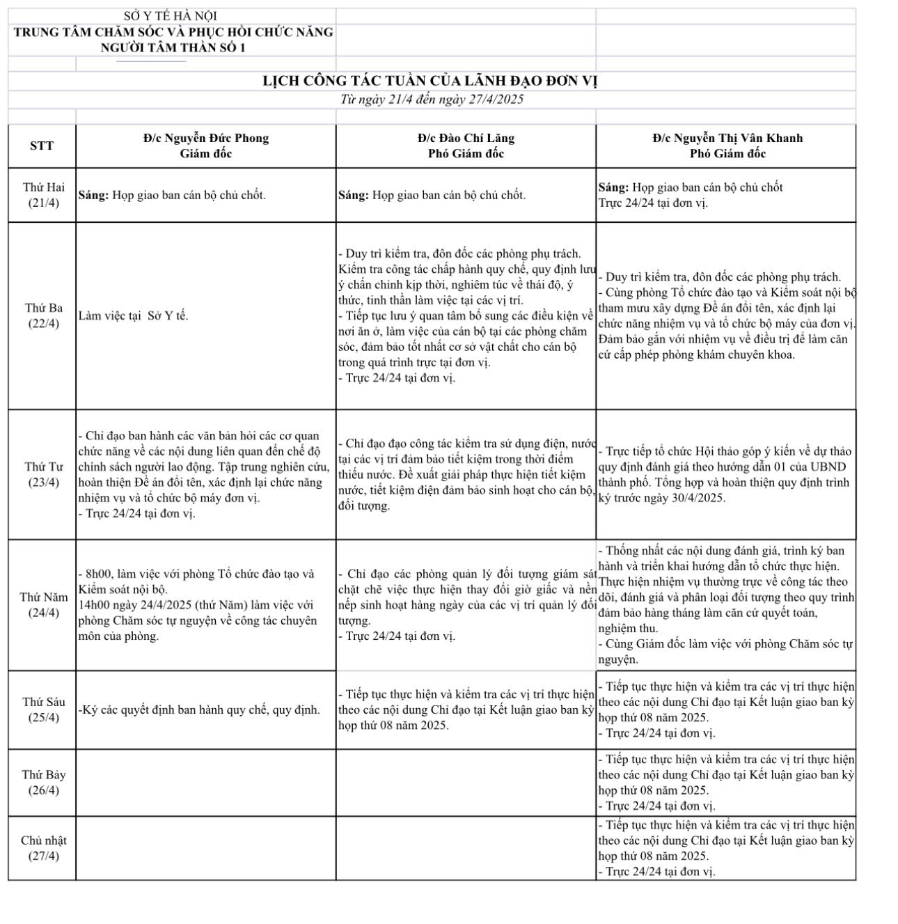Lịch công tác tuần của lãnh đạo đơn vị (Từ ngày 21/4 đến ngày 27/4/2025)