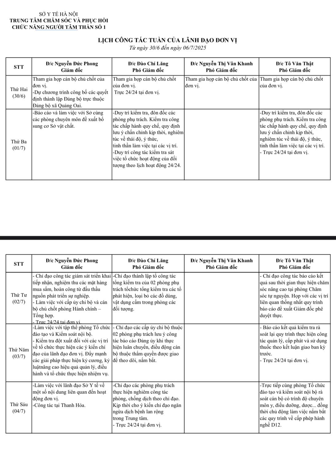 Lịch công tác tuần của lãnh đạo đơn vị (Từ ngày 30/6 đến ngày 06/7/2025)