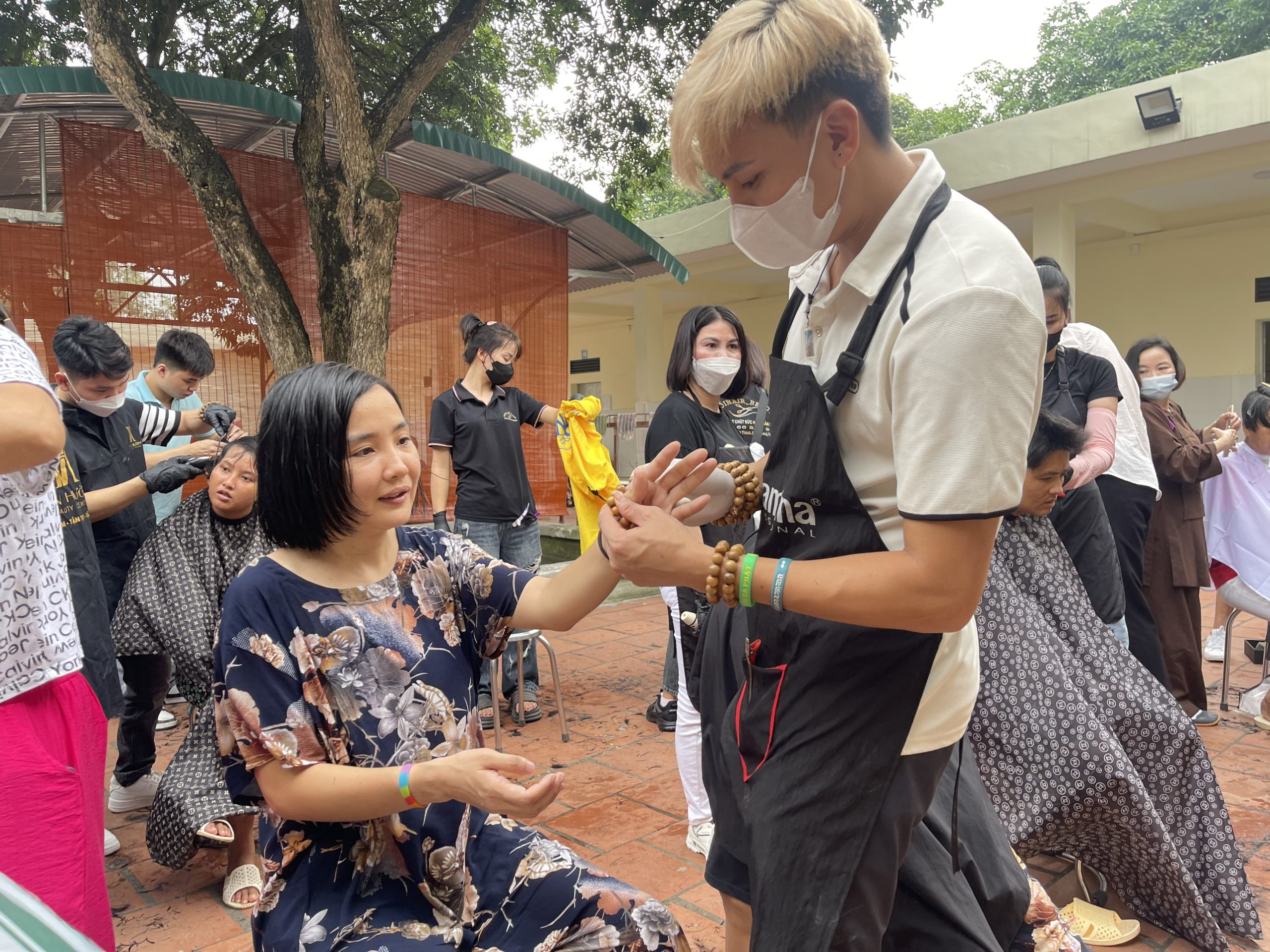 Tại buổi cắt tóc của Trung tâm, gần 700 bệnh nhân đã được nhóm “Trao gửi yêu thương” chỉnh trang chăm sóc tóc nhiệt tình và chu đáo. Để hoàn thành kiểu tóc mới đòi hỏi người mỗi thành viên tham gia phải thực hiện nhiều công đoạn khác nhau. Từ việc đeo khăn, lựa chọn kiểu tóc phù hợp với khuôn mặt đến việc cắt tỉa từng đường nét sao cho đẹp, phù hợp. Tất cả đều được các thành viên thực hiện chuyên nghiệp tạo nên “Ngày hội cắt tóc đặc biệt tại Trung tâm”. Niềm hạnh phúc còn được nhân đôi với người bệnh khi trao tặng những chiếc vòng xinh xắn từ tay các thành viên trong nhóm sau khi hoàn thành việc chỉnh trang tóc.